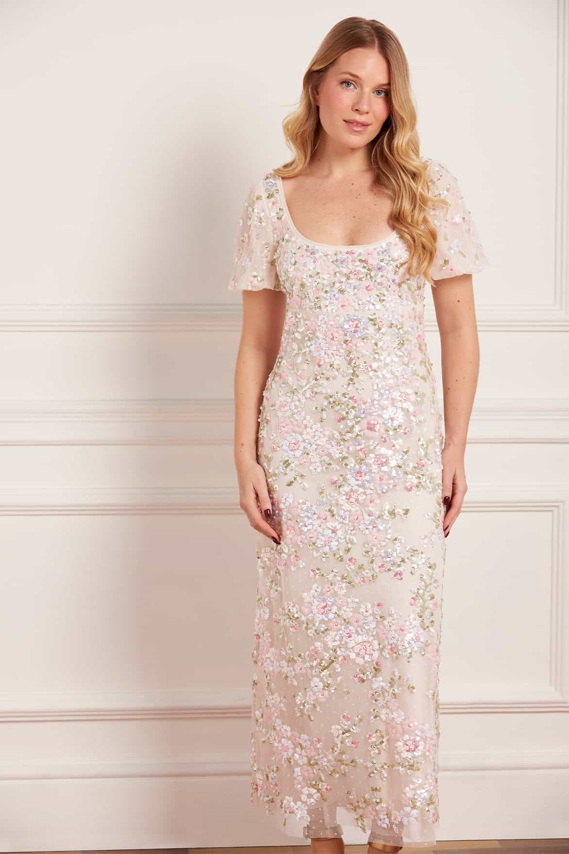 NEW SEASON. The Dream Garland Puff Sleeve Ankle Gown in Cream/Multi. Adorned with intricate floral embellishment, inspired by vintage embroidery. Designed with softly gathered puff sleeves and a full tulle skirt, this gown exudes refined romance and timeless elegance.