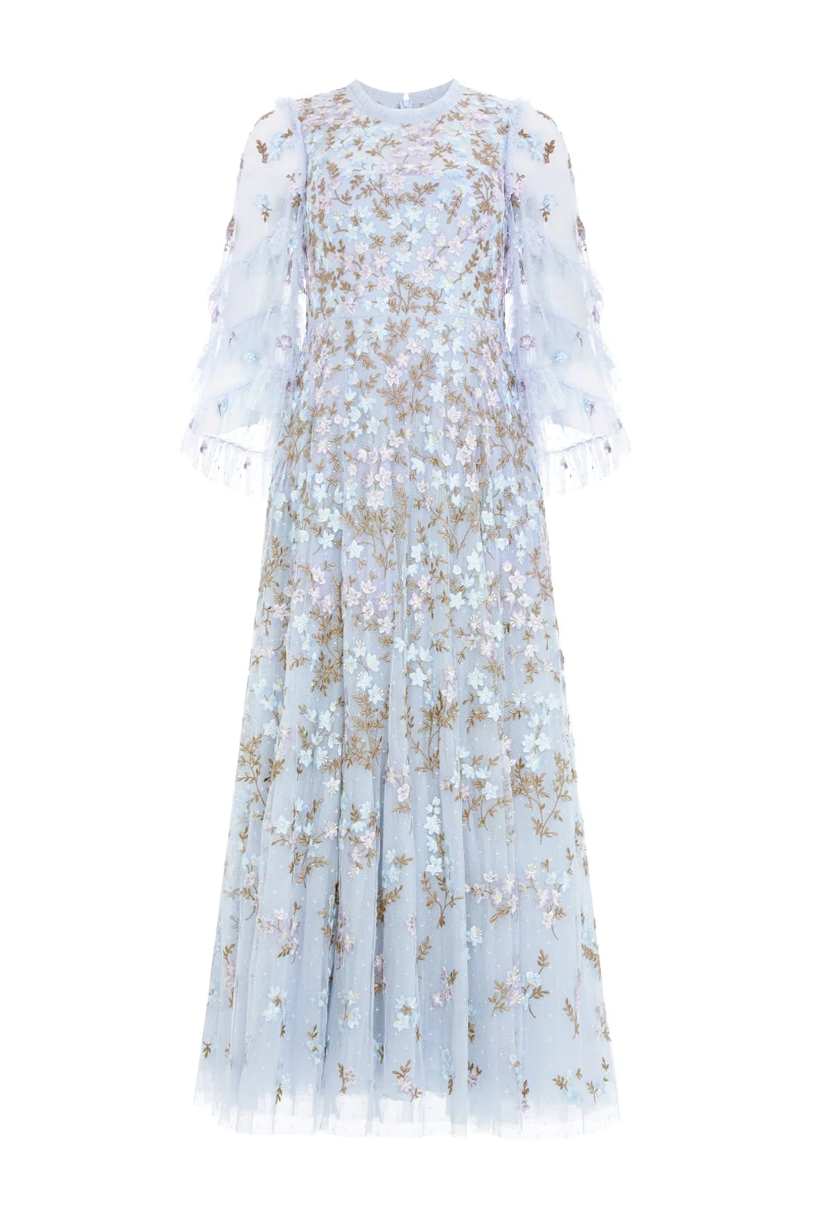 The Everett Bloom Round Neck Ankle Gown in Dusk Blue/Multi. This beautiful gown features exquisite, embroidered artwork inspired by a vintage archive print that showcases floating florals. Beautifully decorated with floral clusters cascading gently toward the hem, enhancing the romantic charm. Designed with fluted sleeves adorned with frothy tulle ruffles and embroidered floral motifs, while the neckline, shoulders, and cuffs feature signature Needle & Thread tulle frills for a touch of romantic elegance. The skirt is composed of generous layers of net and tulle, culminating in a sweeping hemline that adds to the gown's enchanting allure.