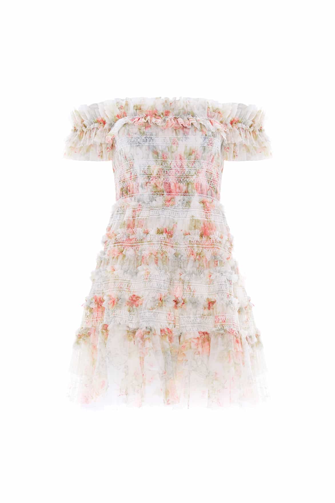 NEW SEASON: The Madame Rose Elodie Off-Shoulder Micro Mini Dress in Moonshine. This opulent dress features an archive-inspired rose print, with an off-shoulder neckline framed by layers of gathered ruffles, creating a soft, romantic effect. The intricate linear smocking design, complemented by signature Needle & Thread tulle frills, gracefully graduates towards the sweeping hem, sculpting a flattering silhouette. Crafted from delicate layers of net and tulle, the skirt flows effortlessly with every movement. An internal stretch power-mesh corset ensures exceptional comfort and shape, while soft boning, encased in grosgrain ribbon, offers refined couture detailing. Elastic trim and adjustable hook-and-eye fastenings provide a customizable, perfect fit.
